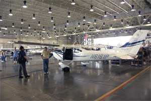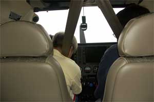 ticket. We flew commercially to Tulsa, Oklahoma, and drove about 90 miles north to Independence, Kansas, arriving there about mid-afternoon. Everyone we met, from the Enterprise-Rent-A-Car people in Tulsa to the cashier at Wal-Mart in Independence was friendly, nice and helpful. Independence only has a population of about 10,000, but they must be supported by a large outlying population as their downtown is much larger than Boulder City's, which has a population of around 15,000. They have many more shops and businesses, including the super Wal-Mart. The countryside is absolutely flat. Our flight instructor pointed out a hill to us, but all we could see in the direction he was pointing was a mound, or a hill wannabe. There are some other differences between there and home. The Albertsons store has a pet food and supply section that takes up four rows. The restaurants put bacon on everything. A salad described on the menu as "crispy greens with garden vegetables" is a bowl of lettuce with one slice of tomato. All the restaurants offer silverware wrapped in napkins; whether it's paper napkins in a fast food place or cloth napkins in a fancy place. Independence has several farm equipment dealers, including a big John Deere dealership just outside of town. Their Title companies are called Abstract companies. I'm sure there's more, but unfortunately, we couldn't spend much time in town. (We both woke up at home Monday morning with a feeling of "missing" Independence.) We did one short flight Thursday afternoon just so we could be shown that everything worked. We spent all day Friday in ground school for the new instrument panel and on Saturday we spent about three hours in the air with an instructor so Steve could get some practical use with it. I was remiss in not getting pictures of the ground school. They wouldn't let me take pictures of the factory -- something they just stopped allowing two to three weeks ago. It's too bad, because the factory was really something to see. It is HUGE. And clean. Despite all the work being done in there, it was amazingly neat. And noisy. If they'd let me take pictures, I would have made a 10-second video, so you could get a real sense of the place. We left Kansas about 7:15 (Central time) Sunday morning, stopped in Santa Fe for gas and a break, and arrived home about 2:15. The weather was absolutely beautiful, giving us a chance to really play with the new panel. We flew on autopilot the whole trip. After take-off and climbing to about 800 feet above ground, we entered our course, activated the autopilot and never touched the controls again except for landing. That's pretty exciting! This airplane can fly up to 20,000 feet above sea level. Above 12,500, we would need to use oxygen, which is on the plane. Since we didn't need to go that high, we didn't get a chance to try it out. |