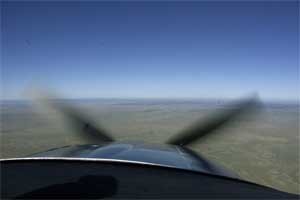 | Now we're at the controls on our way home. We're about 10,000 feet over Texas. | When we're flying, of course we don't see the propeller, but I could see the blades through the view finder of the camera, so I took a picture. I don't understand why I could see them through the view finder... have to do some research. | |