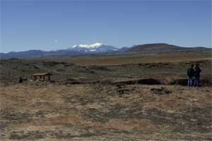 Here's a peek at the peaks of the San Francisco Mountains. On the right is Humphrey (12,633') and on the left is Agassiz (12,356'). Humphrey is the highest peak in Arizona. | By clicking on this picture you can go to a 15 second movie of the falls. It's a Macromedia Flash movie. Click here to download the free Flash Player, if you don't already have it. The movie really gives you a great sense of being there because you can hear (be sure your sound is on) the roar of the falls. You'll also hear Kevon talking about a tire he's watching going around and around a vortex. | ||